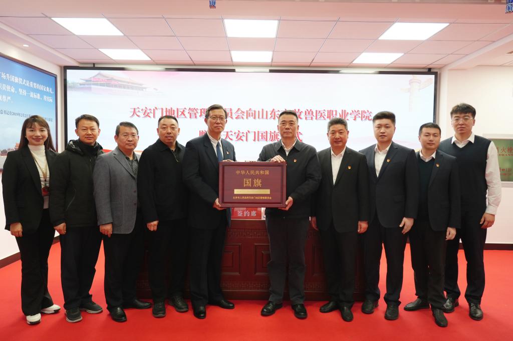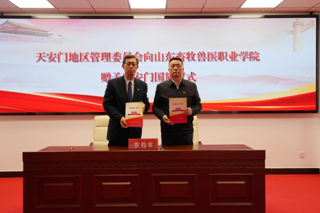 张刚代表学校对天安门地区管理委员会信任学校、赠予意义非凡的五星红旗表示感谢,介绍了学校扎根“三农”保障民生、稳定供给、守护安全工作情况,并就获赠天安门国旗的保护及使用方案做了说明。他表示,学校将以最高规格珍藏,确保国旗神圣尊严,精心组织展示,发挥国旗教育作用;在新生入学、毕业典礼等重要时间节点,组织国旗下宣誓、主题党日、主题团日等主题教育活动,开设“国旗下的思政课”,深度融入教育,筑牢师生信仰之基;发挥学校作为山东省“省级中小学生研学实践教育基地”作用,有计划地向合作企业、中小学、社区及相关单位开放预约参观,让更多人了解国旗文化,激发社会公众的爱国热情。