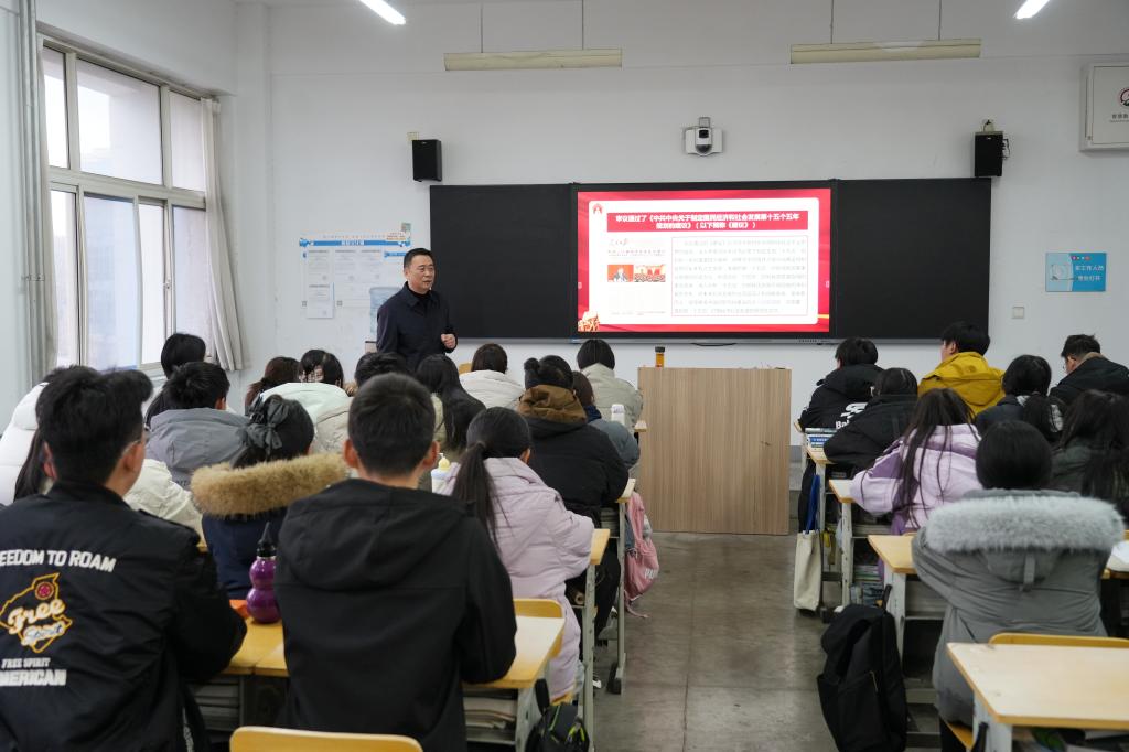 12月11日,学校党委书记张刚到2025级畜牧兽医“3+2”专本贯通2班,以“学习贯彻党的二十届四中全会精神 在农业强国建设中谱写青春华章”为主题,为学生讲授思政课。