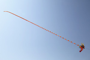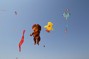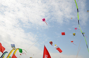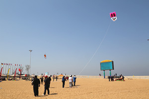 我院共有10只风筝参与了翅类、板类、翅式串类和板式串类等放飞比赛和表演,均取得了较好成绩。其中,突出展示我院形象的“山东牧院”巨型风筝格外引人注目。美丽的滨海旅游度假区人工沙滩上,风和日丽,在蓝天碧水沙滩的映衬下,风筝群显得格外美丽。沙燕、金鱼、蝴蝶、老鹰、龙头蜈蚣等古朴典雅的传统风筝与大气活泼的现代风筝竞相飞舞,使滨海人工沙滩成为了一片风筝的海洋。