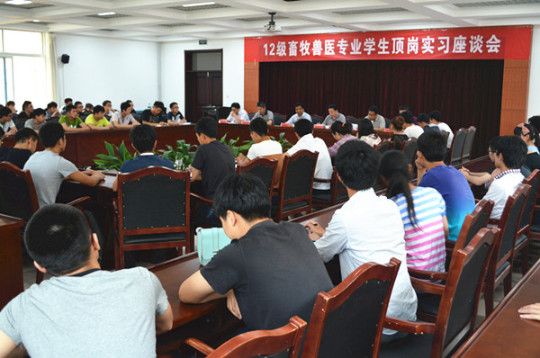 5月21日,动物科技系召开2012级畜牧兽医专业学生顶岗实习座谈会。系负责人、有关专业教师和100多名学生代表参加。