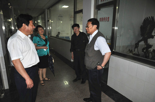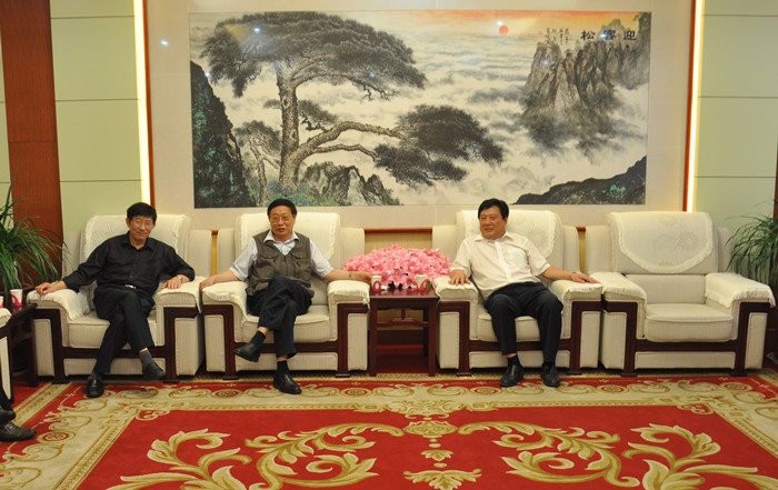 郑立森院长(左一)向刘秀梵院士(右一)、侯家法教授(右二)介绍我院情况