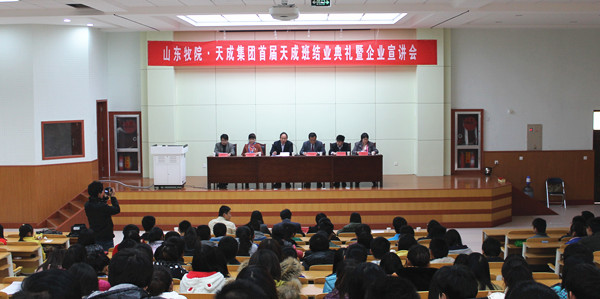 周其虎副院长在致辞中对结业学员表示祝贺。他说,“天成班”的举办为学员搭建了很好的平台,通过专题报告、参观企业、学习座谈、经验交流、拓展训练、顶岗实习等途径,开阔了视野,增长了知识,锻炼了技能。李进文副总经理希望学员们发挥所学,努力奉献于畜牧业的发展,同时希望继续发挥学院优势,加强与天成集团的合作,为天成集团培养输送更多优秀人才。会上还举行了寿光天成集团企业宣讲会。(防检系 王志杰供稿)